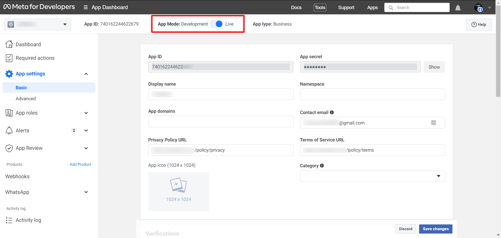 Then from the App settings, click on the Basic option and add the Privacy Policy URL and Terms of Service URL from the WabaHero. These URLs are available on the Connect bot page of WabaHero. After adding these URLs just click on the “Save changes” button.