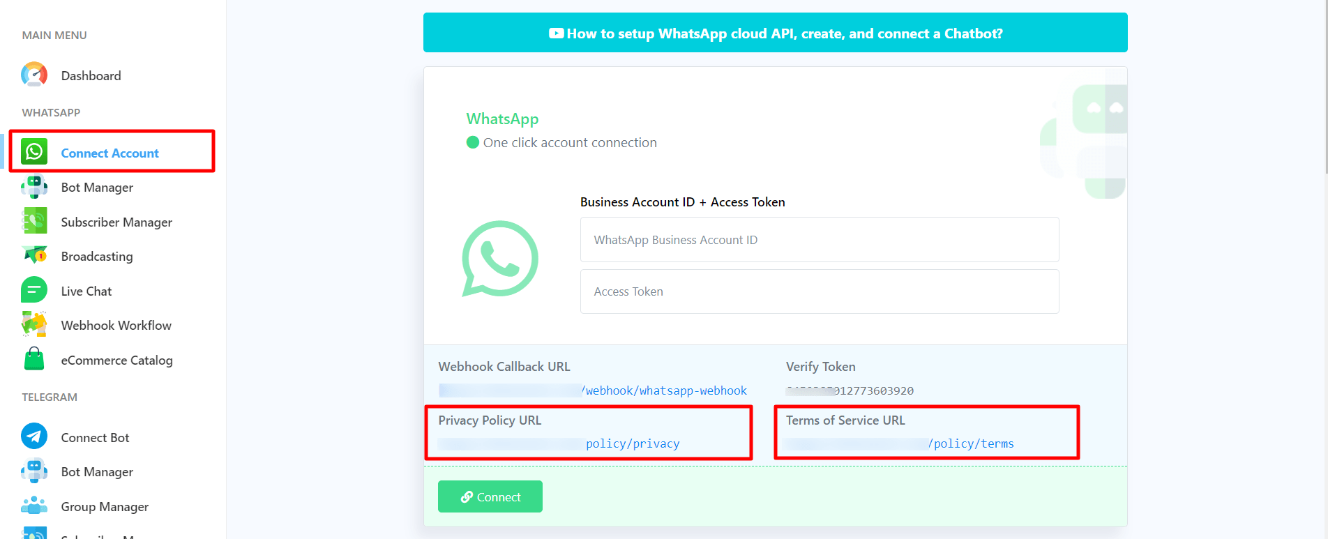 To get the callback URL and verify the token from WabaHero. Login to your account and go to the dashboard of WabaHero. At the left sidebar of the Dashboard, under the WhatsApp section, you will see connect WhatsApp option. Now click on the connect WhatsApp menu and instantly, Connect WhatsApp Business page will appear.